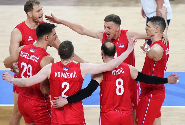 同一天,法国队3-2击败塞尔维亚队,在南巴黎竞技场举行的巴黎奥运会男子排球小组赛A组赛。