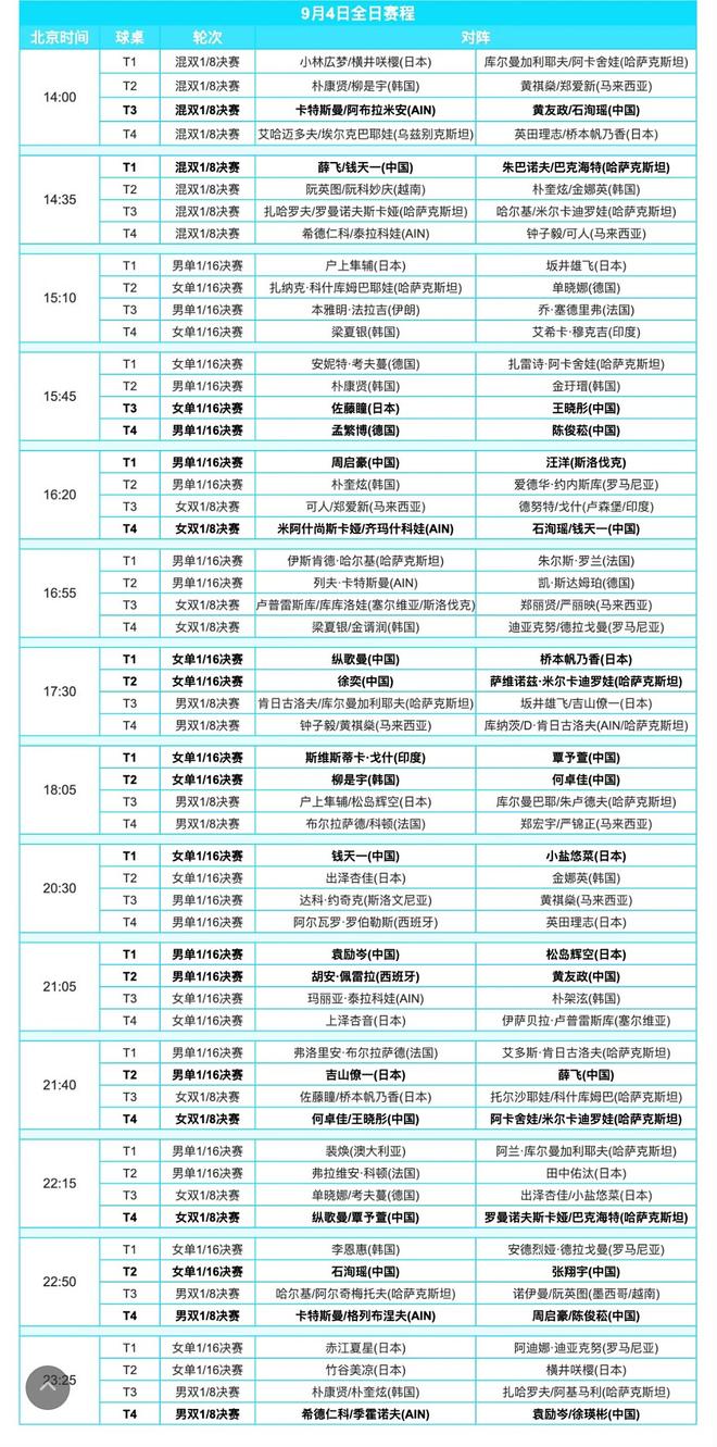 北京时间9月3日晚,随着袁励岑3-0哈萨克斯坦选手弗拉基米尔·扎哈罗夫,陈俊菘3-0法国选手亚历克斯·小井,加上之前徐奕3-1玛丽亚·潘菲洛娃,张翔宇3-0卢森堡选手莎拉·德努特,国乒四位参加WTT阿拉木图站资格赛的选手全部晋级正赛。随着资格赛的结束,正赛首轮也对阵出炉。我们看一下今日对阵与赛程表,如下图: