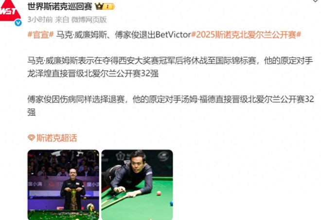 十月的斯诺克赛场上,一波又一波的新闻。刚刚在西安赢得冠军的威廉姆斯成为了头条新闻,但这一次不是因为他赢了,而是因为他退出了比赛。世界台湾联合会正式证实,威廉姆斯和傅家俊都退出了北爱尔兰公开赛,这使得未来几天的日程安排更加多变。