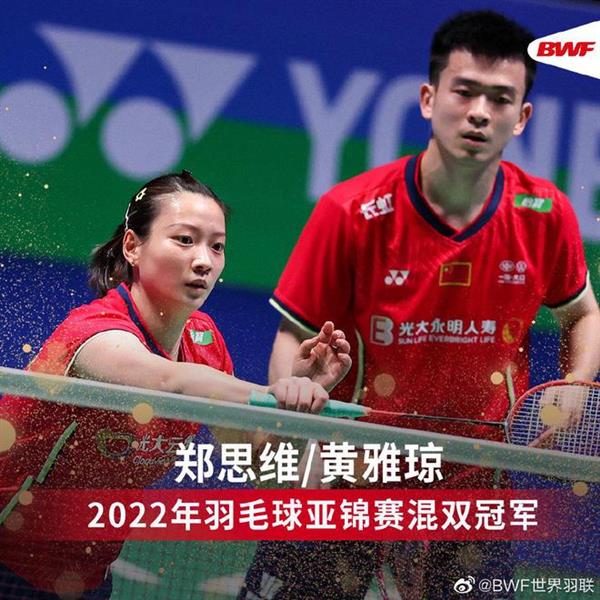 2022年羽毛球亚洲锦标赛,混双决赛郑思维/黄雅琼2-0战胜队友王懿律/黄东萍,女双陈清晨/贾一凡2-0击败日本组合岩永玲/中西贵映,国羽在本届亚锦赛上拿到三项冠军。