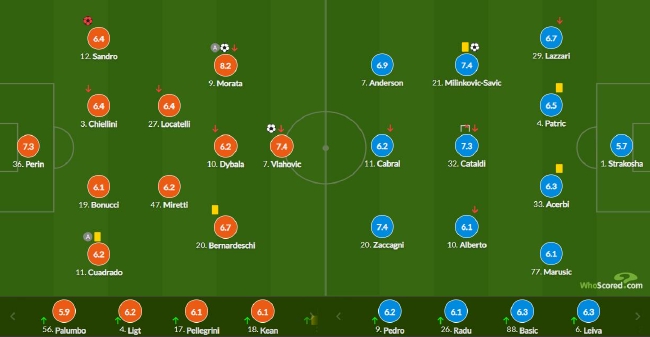 拉齐奥2-2,萨维奇尤文(4-2-3-1):36-佩林;11-夸德拉多,19-博努奇,3-基耶利尼(18',4-德里赫特),12-桑德罗;27-洛卡特利(62',38-阿克),47-米雷蒂;20-贝尔纳代斯基,10-迪巴拉(78',56-帕伦博),9-莫拉塔(62',17-佩莱格里尼);7-弗拉霍维奇(62',18-基恩)