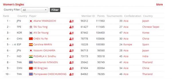 女单日本名将山口茜继续排在首位,中国台北名将戴资颖次席,韩国的安洗莹第三,陈雨菲第四。西班牙的马林第五,另外一位日本名将奥原希望第六,印度名将辛杜和泰国的拉特查诺分列第七和第八,何冰娇排在第九,泰国的李美妙第十。王祉怡第11,韩悦第17,张艺曼排在第32。