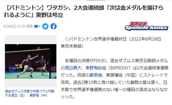 北京时间8月28日消息,羽毛球世锦赛混双决战,主场作战的渡边勇大/东野有纱完败给中国组合郑思维/黄雅琼,而据日本媒体报道,东野有纱输球后嚎啕大哭,接受采访时直言自己非常不甘心,希望在接下来的日本公开赛上复仇。