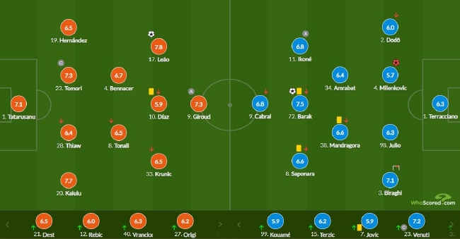AC米兰(4-2-3-1),1-塔塔鲁萨努,20-卡鲁鲁鲁,28-蒂奥(56,21-德斯特),23-托莫里,19-特奥,4-本纳塞尔,8-托纳利(86,12-雷比奇),33-克鲁尼奇(75,40-弗兰克斯),10-迪亚斯(55,27-奥里吉),17-吉鲁吉鲁