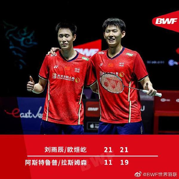 男双刘雨辰/欧轩屹首战丹麦组合阿斯特鲁普/拉斯姆森,首场比赛刘雨辰/欧轩屹迅速进入状态,两人配合默契进攻非常激烈,上来就以8-1领先,被追到11-9后连得6分,再次拉开分差以21-11领先。第二局双方争夺激烈,比分紧咬18平,刘雨辰/欧轩屹以21-19领先,总比分2-0领先小组赛。