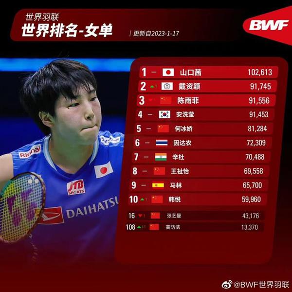 女单陈雨菲排名下降到第三位,何冰娇排名第五,日本选手山口倩继续排名第一。