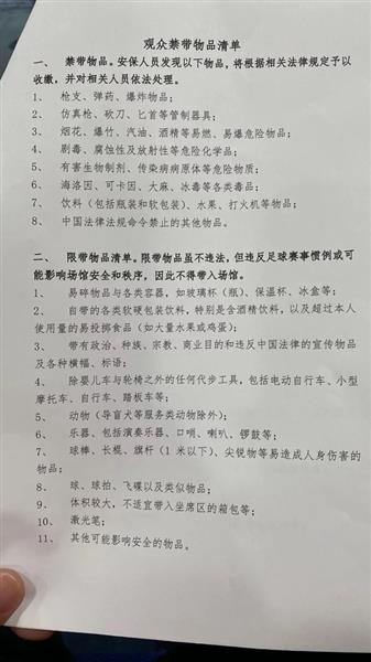 2、限制物品清单。限制物品虽然不违法,但是违反足球比赛的惯例可能会影响场馆的安全和秩序,所以不能带进场馆。