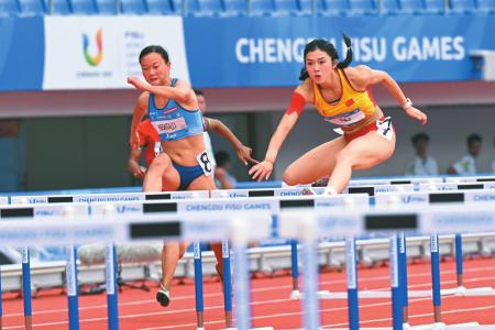 8月3日,代表中国的四川女孩吴艳妮(右)在成都大运会女子100米跨栏预赛中。新华社发布了新华社。