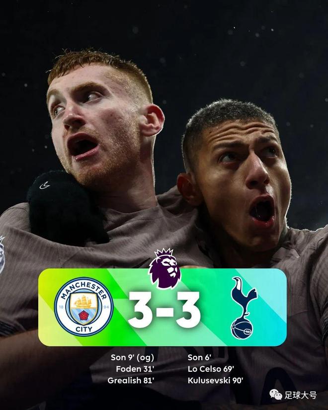 下半场,孙兴戬助攻洛塞尔索远射扳平,哈兰德助攻格拉利什3-2反超,库鲁在90分钟内将阿克推入头球,3-3。