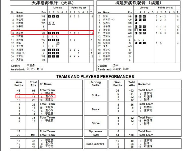 在这场战争中,李盈莹得到了全场最高的18分,袁心玥得到了15分,王艺竹得到了12分,王媛媛得到了7分。袁心玥效率很高,扣球15扣12中,拦网3分。
