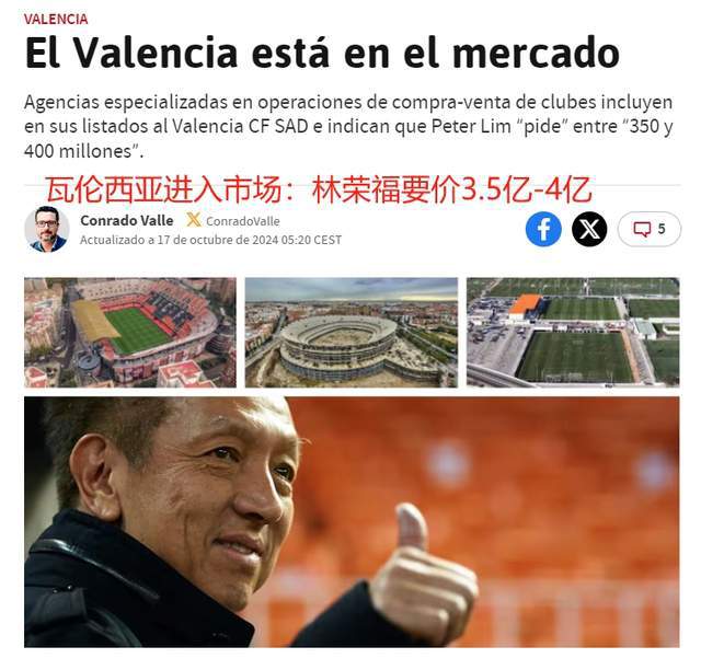 《阿斯报》写道,一家专门从事俱乐部交易的机构将瓦伦西亚列入交易名单。林荣福向瓦伦西亚明确标注了价格:3.5亿到4亿欧元,可以从他手中买90.5%的股份。