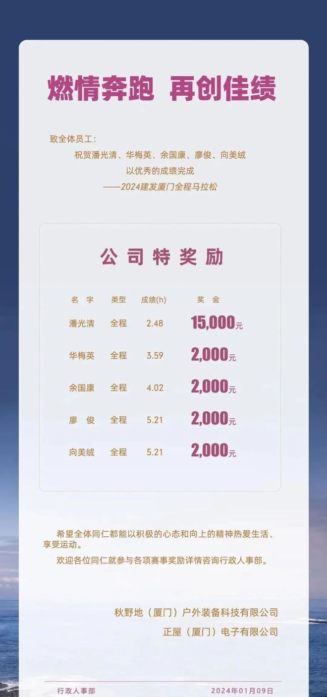 另一家是别人家的公司!2025年厦门马匹比赛结束后,秋野户外设备科技公司发布公司文件,引起跑友的广泛关注,吸引了无数跑友羡慕的目光。全马245可获得1.8万元奖励,比赛结束至少可获得2000元奖励!真的希望我们单位领导能看到,感动: