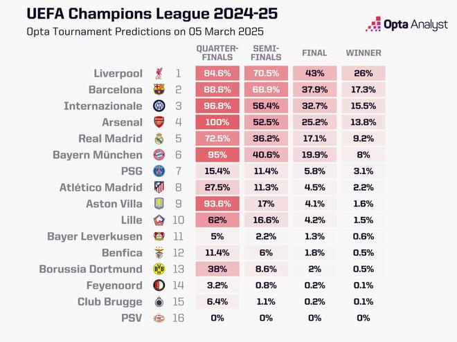 Opta欧冠最新预测:利物浦、巴萨、国米夺冠概率前三