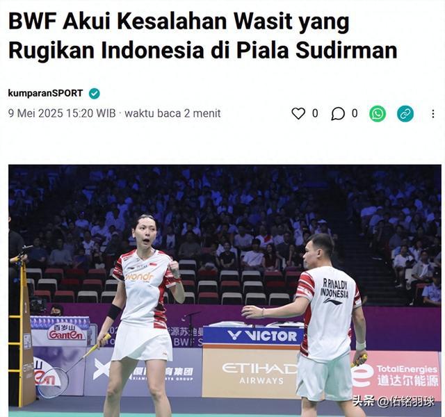 5月9日下午,印尼多家媒体报道,世界羽联报道,世界羽联(BWF)在苏迪曼杯小组赛中,裁判对印尼选手的不利判罚已经向印尼羽毛球协会提出(PBSI)作出回应。