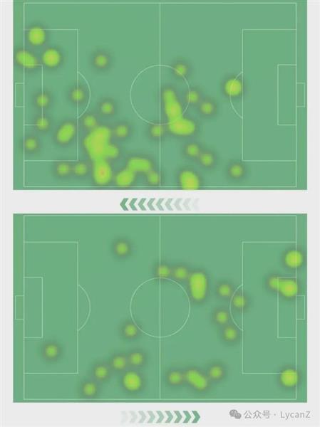 普利西奇首发63分钟触球46次(上),上轮奇克首发65分钟触球21次(下)。