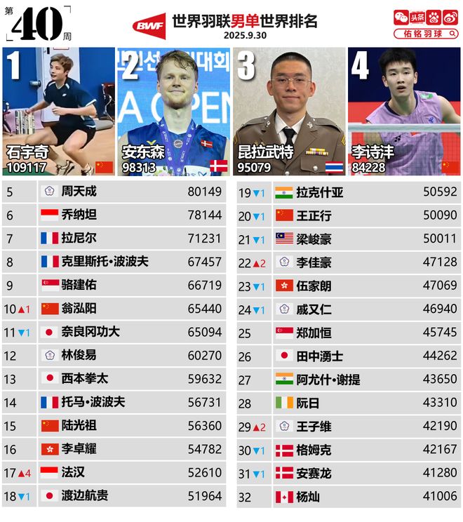 随着2025年韩国羽毛球公开赛的结束,世界羽毛球联合会第40周的排名已经发布。由于比赛拥挤,许多著名球员退出了今年的韩国公开赛,因此世界前32名的排名变化并不是很激烈。