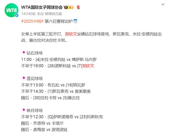 为了让更多的球迷关注郑钦文的比赛,央视还安排了CCTV5频道进行现场直播,继续在第一个钻石球场亮相。无论是比赛时间还是比赛场地,都是超级巨星的待遇。