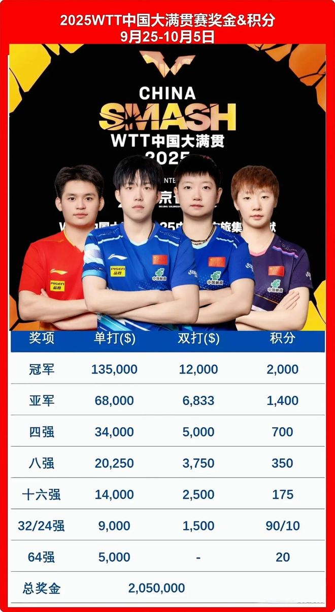 中国大满贯奖金收入出炉!王楚钦106万,王曼昱102万,最低7200元