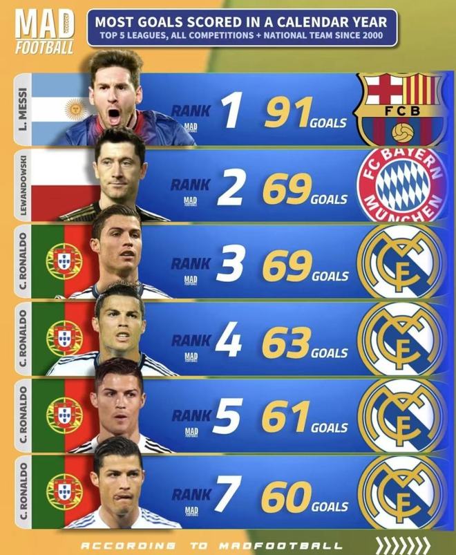 梅西91球神迹至今无人破!自然年进球排名:前六名中C罗出现四次