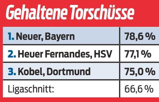 《体育图片》统计了本赛季德甲球队门将的扑救成功率,老将诺伊尔以78.6%的扑救成功率排名第一。第二名是费尔南德斯,他升级到马汉堡,扑救成功率为77.1%。多特蒙德门将科贝尔排名第三,扑救成功率为75%。