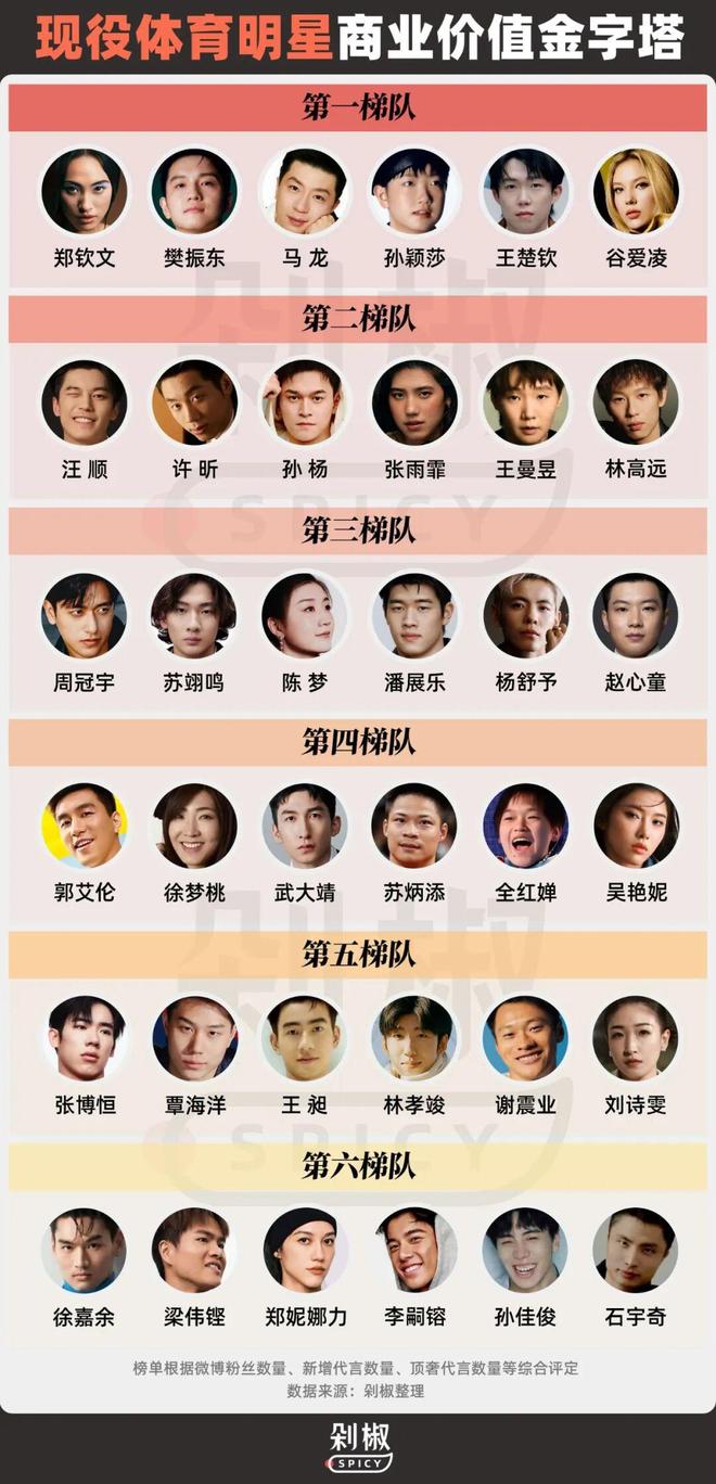 根据体育表现、粉丝数量、新代言、顶级奢侈品合作、讨论指数五个维度,切椒Spicy梳理了自2024年以来中国体育明星的商业代言,并划分了金字塔梯队,每个梯队根据最近的整体商业价值从左到右排列。值得注意的是,虽然高净值圈的影响力与国家交付能力相同,但很难直接进行横向比较。运动员商业价值的核心是匹配不同品牌的差异化需求,而不是简单的梯队水平。同时,库存只涉及运动员的个人代言,而不包括他们的团队代言。