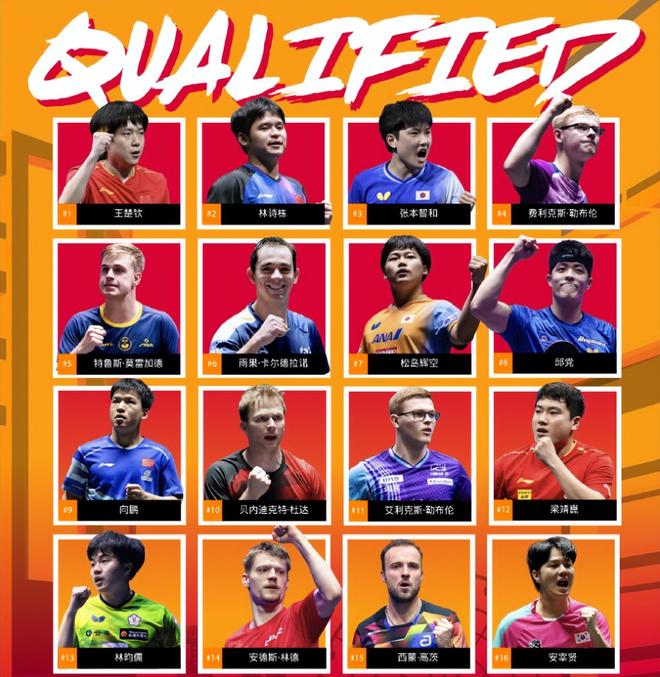 入选男子单打的球员包括王楚钦、林诗栋、雨果、张本智和、费利克斯、松岛辉空、莫雷加德、邱党、杜达、向鹏、林德、林昀儒、艾利克斯、勒布伦、梁靖邈、安宰贤、西蒙、高茨。男子单打的16名球员名单全部公布。艾利克斯.勒布伦、西蒙、高茨和安宰贤被添加到两周前公布的名单中。