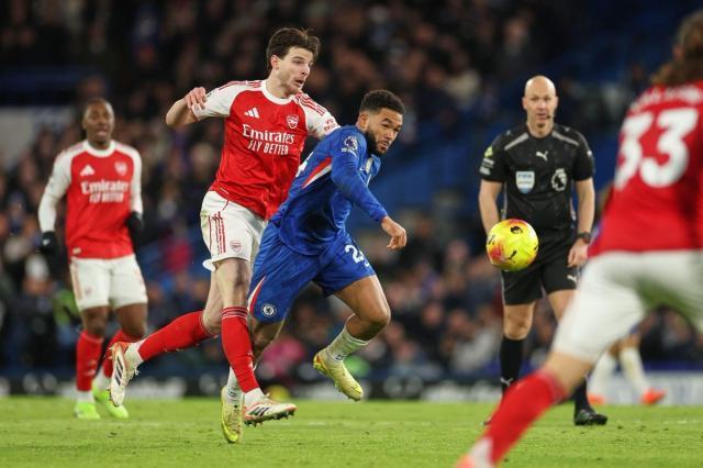 13'赖斯大力手抛球被解围后,埃泽传到右边空当,萨卡低射被罗伯特·桑切斯用腿挡住。