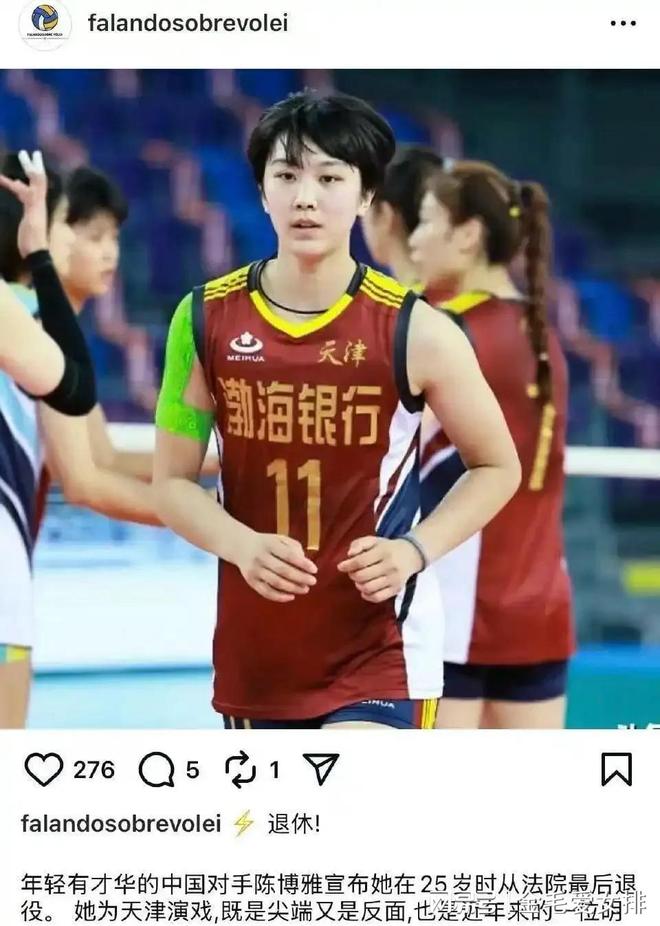 最近,一些外国排球媒体报道称,天津女排陈博雅退役了,全文如下:年轻而有才华的中国排球运动员陈博雅宣布,她在25岁时从天津女排退役。她为天津效力,不仅是主要的进攻者,也是近年来天津女排的明星球员,现在宣布退役!