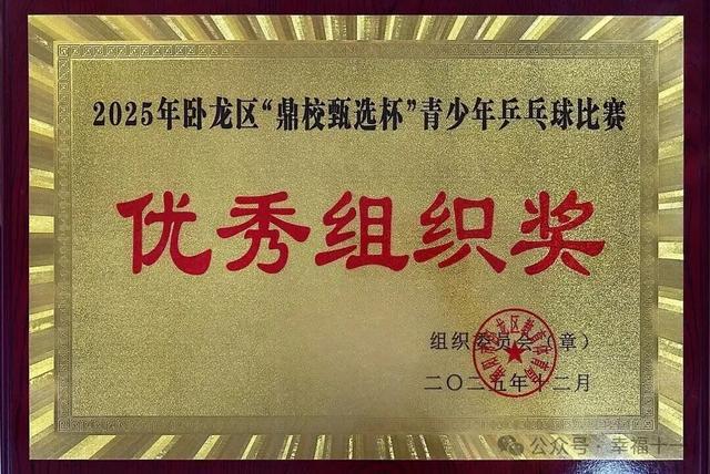 12月10日,南阳市卧龙区2025年“鼎校甄选杯”青少年乒乓球比赛落下帷幕,南阳市第十一小学代表队连创佳绩,荣获优秀组织奖。