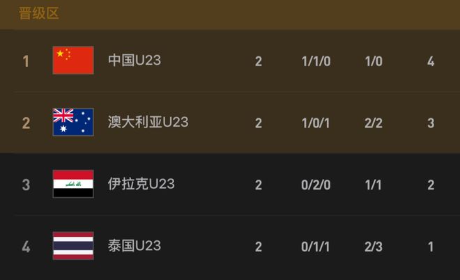 2.澳大利亚和伊拉克打平,同为4分的中、澳、泰将不得不比较相互比赛间净胜球,3队争2个出线名额;若U23国足输泰国队2球及以上,将被淘汰。