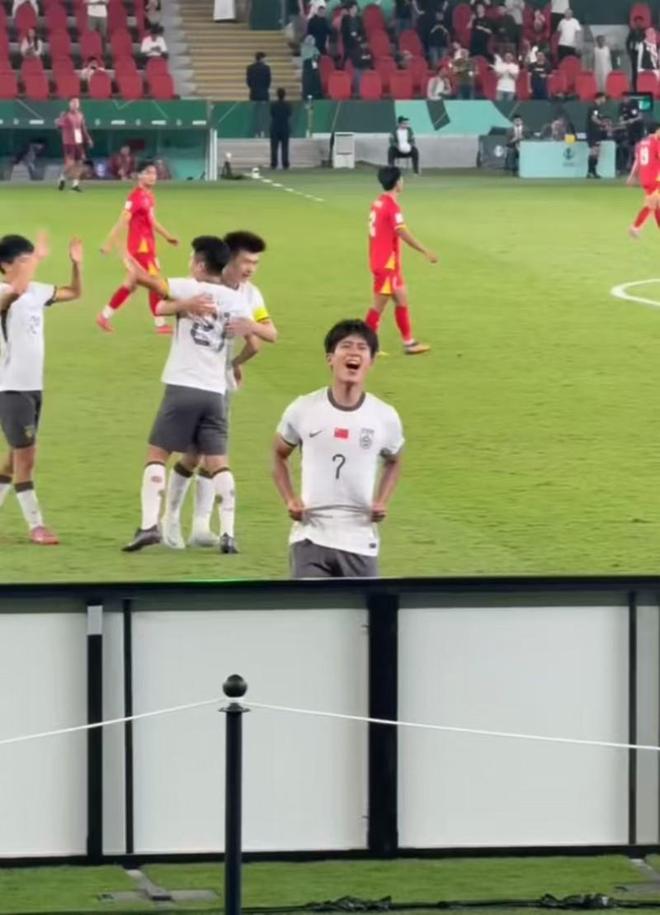 进入这一精彩进球后,向余望兴奋地冲向球场,模仿偶像C罗“SIU”标志性的庆祝动作,随后又兴奋地对着球迷大喊大叫,挥拳庆祝。