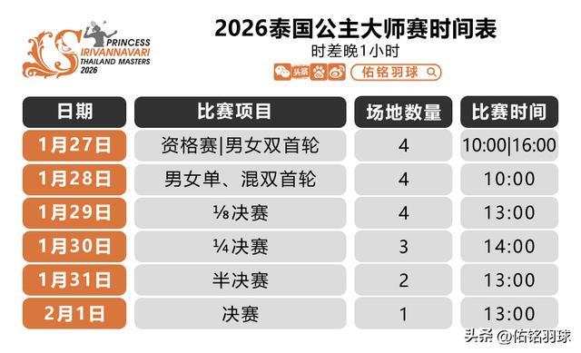 1月26日,世界羽毛球联合会更新了2026年泰国公主羽毛球大师赛的签表。原本参加比赛的顶级球员并不多。经过连续三周的比赛,著名球员退出比赛,包括男单头种子骆建佑、混双头种子希达亚图拉/帕萨里布、上周闯入女单决赛的泰国美少女碧查梦等。