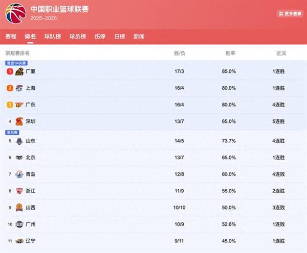 - 2026-01-28CBA排行榜:广东掉落榜首成第3,北京被挤出前5,辽篮起死回生