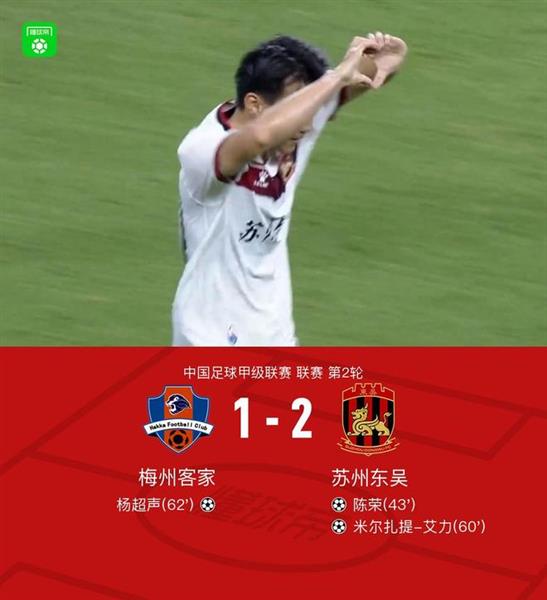 梅州客家主场对阵苏州东吴,北京时间3月21日中国足球甲级联赛第二轮。梅州客家杨超声破门。苏州东吴陈荣破门,米尔扎提-艾力破门。最后,梅州客家比分 1-2 苏州东吴。