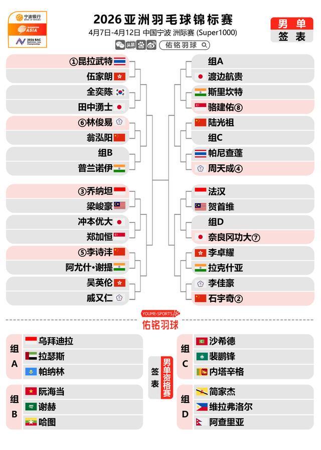 - 2026-04-07亚锦赛开拍!陈雨菲、混双王牌退赛,NO.1领衔,国羽首日8人登场