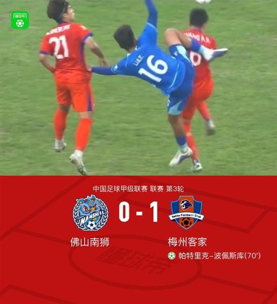 中国足球甲级联赛第三轮北京时间4月5日,佛山南狮主场迎战梅州客家。梅州客家帕特里克-波佩斯库破门而入。佛山南狮最终得分 0-1 梅州客家。