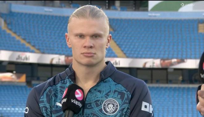 在英超联赛第33轮,曼城主场2-1击败阿森纳,比赛结束后,哈兰德接受了Viaplay。采访Football。