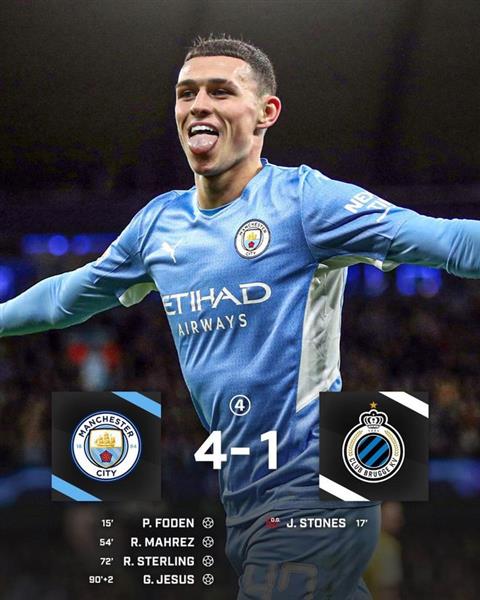 终场伤停补时阶段,坎塞洛前场右侧得球接连内切,后一脚斜传,热苏斯禁区左边右脚迎球推射入网,曼城确定胜局,4-1!全场竞赛完毕,曼城主场4-1力克布鲁日。