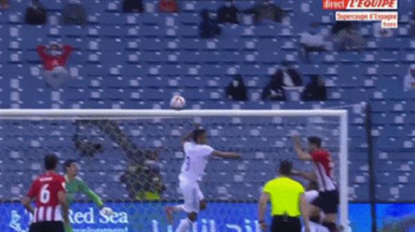 第50分钟,本泽马射门,耶莱在禁区内封堵时手臂碰到球,主裁判到场边观看VAR后判罚点球,毕巴主帅马塞利诺抗议判罚被黄牌警告。第52分钟,本泽马主罚点球得分,皇马2-0!