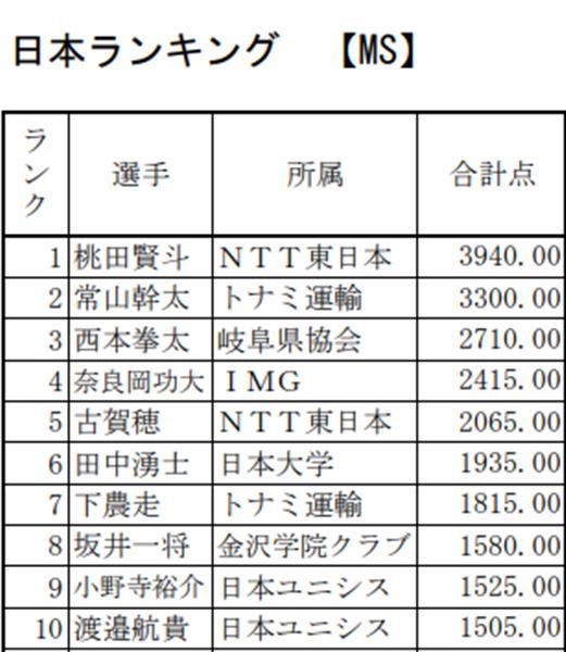 日本男单前三仍然是桃田贤斗、常山干太和西本拳太,上升较快的是夺得2021年全日本归纳锦标赛男单冠军的田中湧士,来到第六的方位。