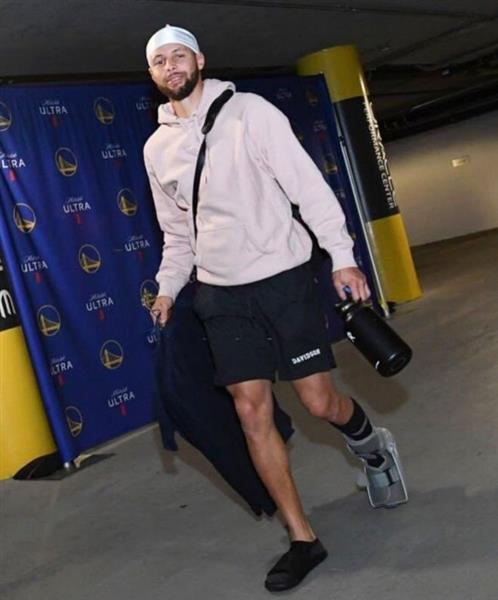 赛前勇士球星库里在承受媒体采访时已经穿上了厚重的保护靴。